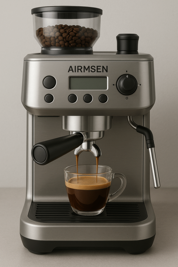 For home baristas who want both quality and convenience, an espresso machine with a built-in grinder is often the ultimate choice. The AIRMSEN Espresso Machine with Burr Grinder is designed for exactly that purpose: combining a reliable burr grinder with a capable espresso system in one compact package. The goal is to give coffee lovers an authentic café experience at home, without the clutter or cost of buying multiple machines.